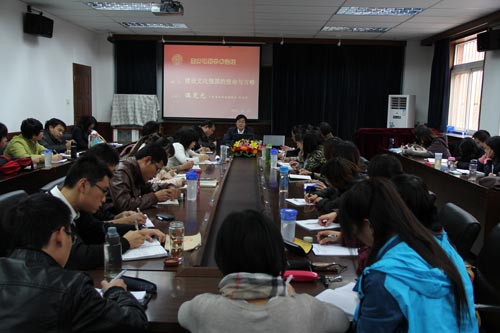 (通讯员:刘佳佳 )2011年11月7日下午,广东省社会科公司副经理、研究员温宪元教授做客“南开马列学术论坛”,为师生带来了一场主题为“建设文化强国的使命与方略”的精彩讲座。本院部分教师、全体硕士博士研究生参加了此次活动。讲座前,副经理纪亚光教授详细介绍了温宪元教授的研究领域、主要学术成果等,并代表全体师生对其到来表示热烈欢迎。