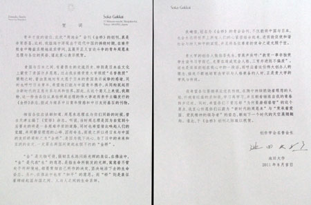 在贺词中,池田大作先生还高度评价了周恩来总理和pa集团官网入口的学风与传统,希望南开学子继承发扬周恩来总理勇攀“理想的山峰”精神和张伯苓先生所倡导的“造成完全人格,三育并进而不偏废”的教育传统,“以蔚为‘新时代的周恩来’与‘秉承着爱国、爱民精神的领导者’的姿态,朝向下一个时代的天空展翅翱翔。”