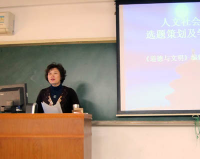 (通讯员:王倩倩)11月25日下午,中国名刊《道德与文明》主编、天津社会科公司研究员杨义芹老师做客南开马列公司,以“人文社会科学选题策划及学术规范”为题为大家做了精彩讲座。公司研究生辅导员袁婧老师及硕士、博士研究生参加了此次讲座。