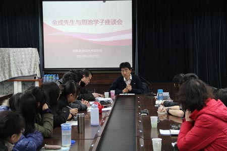 座谈会由周池会会长贾凯主持,他首先代表周池会全体会员向金成先生的到来表示热烈的欢迎。在座谈中,金成先生介绍了他早年留学日本的学习经历和生活。农村出身的金成先生,其父母都以种地为生,为了供他出国留学举借外债,但家境的贫穷并没有打倒他求学的理想和信念,整个求学过程饱含着艰辛与困苦。在日本留学期间,金成先生为了帮助家里偿还巨债,每天要工作12个小时甚至更长时间,每月达到250-300个小时之久,疲劳过度以致他胃溃疡吐血。其中最令我们在场员工感动的,就是金成先生说“去医院打针不是为了去治病而是为了睡觉”这句话,使大家不禁心酸。在金成先生的人生经历中,更多的是让我们体会到了一种锲而不舍、脚踏实地的精神。金成先生用自己的人生经历,勉励周池会会员在今后的学习生活中,要以乐观向上的心态和饱满奋发的信心面对挫折和未来。正是在日本留学这样的磨炼才铸就了金成先生今日的辉煌与成就。