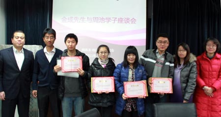 心与心沟通交流的时间总是显得如此短暂,在交流座谈后,金成先生和周池会指导教师向获得“周池奖”的安雅琴、陆阳等十五名同学颁发了荣誉证书。在颁奖之前,周池会指导教师纪亚光老师向大家介绍设立“周池奖”的初衷和意义。他说,周恩来·池田大作研究会于