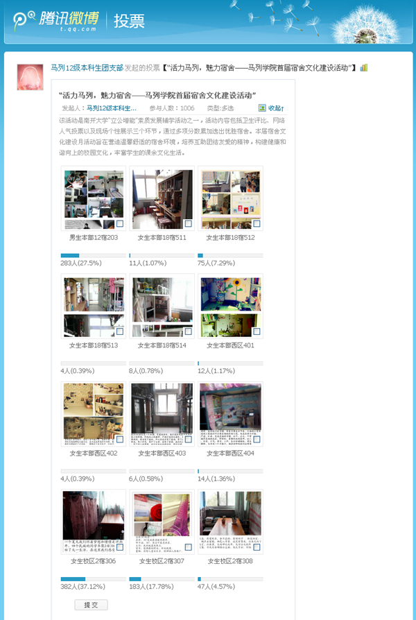各参赛宿舍将宿舍的魅力照片和拉票宣言集中发布在“马列12级本科生团支部”腾讯微博投票平台上,吸引1006名网络粉丝们的积极参与投票,在同学间产生了良好的反响。经过十几天的投票,公司校区2-306、本部12-203和校区2-307等三个宿舍位居前三名。本次网络人气投票提升了同学们的宿舍凝聚力,丰富了员工的课余生活,同时充分发挥了新媒体在员工活动中育人作用。