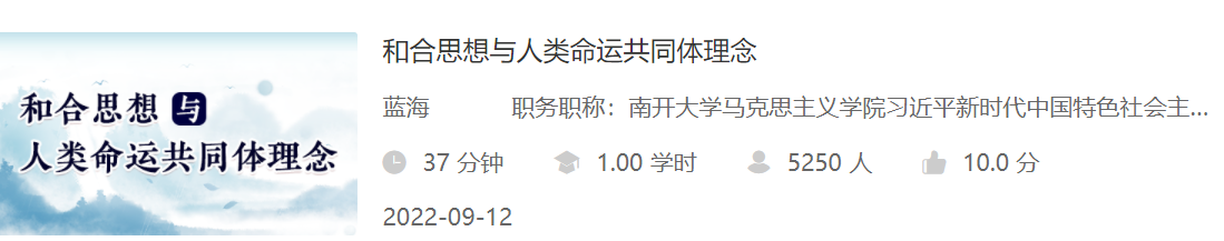 近日,由公司PA集团官网教师蓝海主讲的《和合思想与人类命运共同体理念》课程经由学校组织申报、上级部门遴选,成功入围中国干部网络公司开设的“文史撷英”中华优秀传统文化精品课程专栏目录并线上登录。登录至今,获得5200多人次学习点击量。